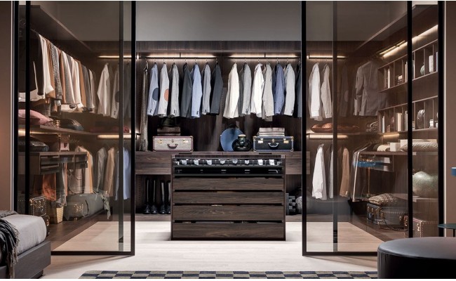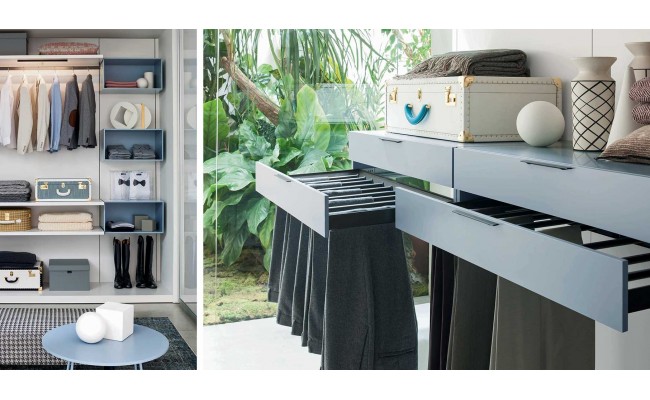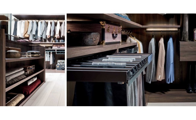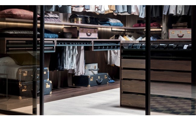 Capiente, funzionale e componibile, la cabina armadio Break di Novamobili può essere attrezzata con moduli angolari, luci led retro ripiani, cassetti in vetro fumé, tubi appendiabiti e accessori in finitura brunita. Il sistema a cremagliera, eliminando i fianchi di sostegno, risulta essere visivamente molto leggero. Disponibile in tutte le tonalità laccate opache, nelle finiture rovere gessato ed olmo scuro.