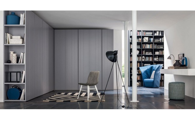 Scenografica la configurazione ad angolo dell'armadio anta battente Stripe con maniglia gola integrata e terminale a giorno. Disponibile in tutte le tonalità laccate opache.