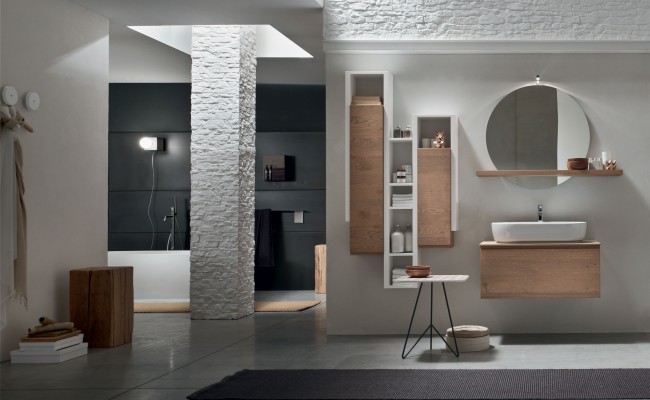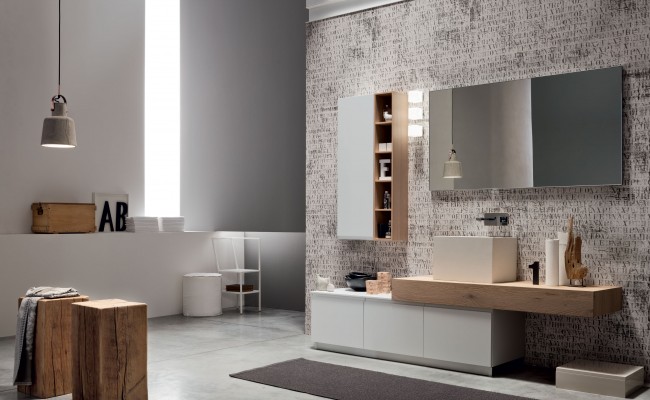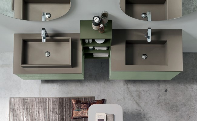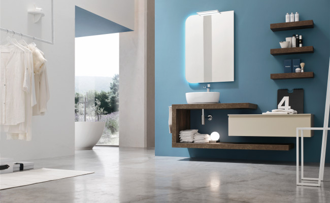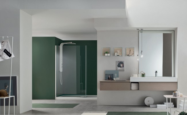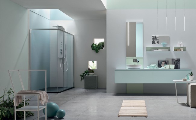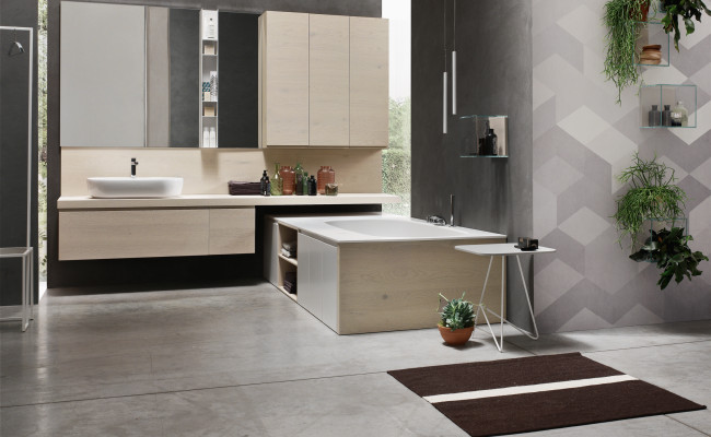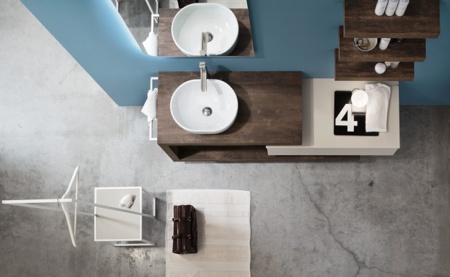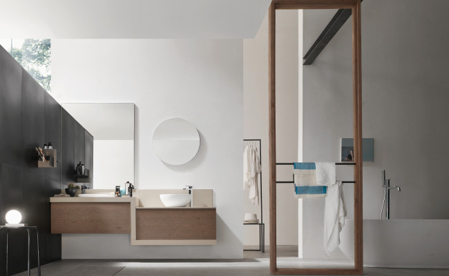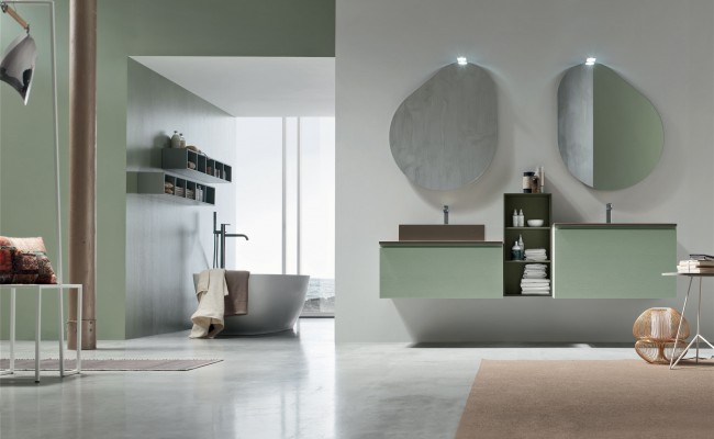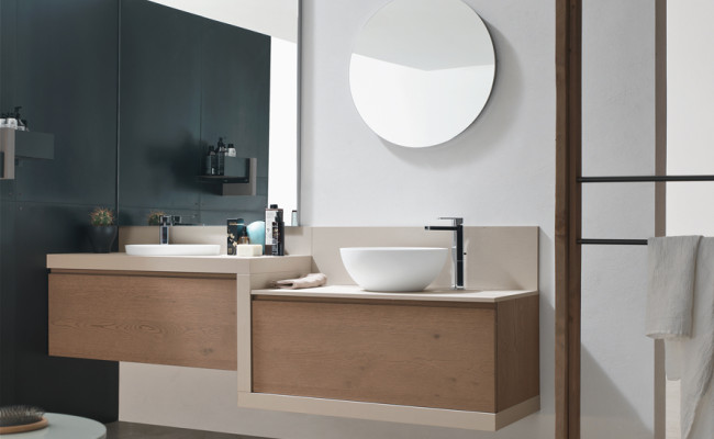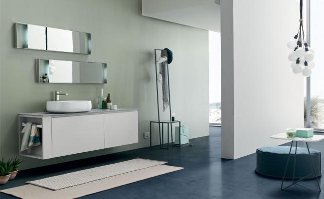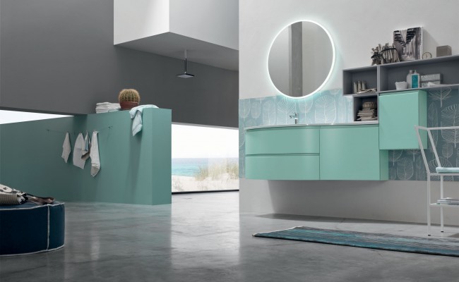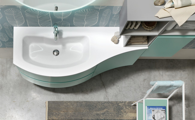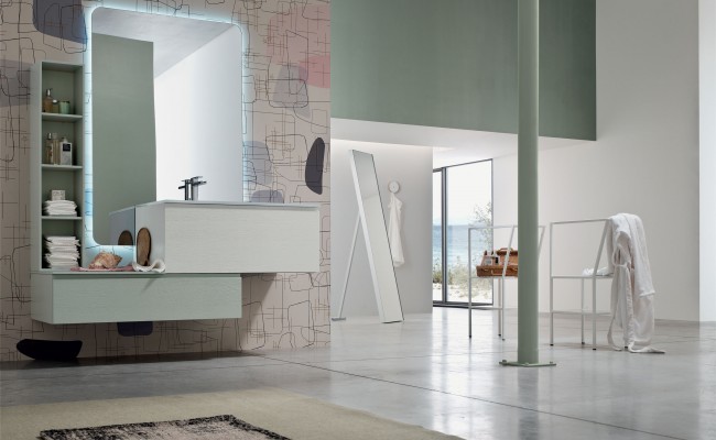 L'anta a gola per esaltarne le linee, l'essenza del Rovere per sottolineare il legame con la natura, tonalità prese in prestito dal cielo, dal mare e dalle piante. Per creare un ambiente bagno che rigenera corpo e mente.