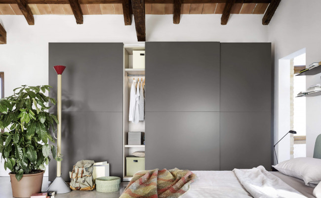 Un sottile profilo attraversa le ante dell'armadio scorrevole Allison – disponibile nelle finiture materiche, ecolegno, super-mat e laccato opaco – scandendone ritmicamente la superficie. L'armadio può essere a incasso, a muro o angolare.