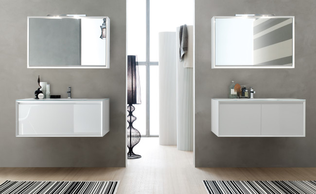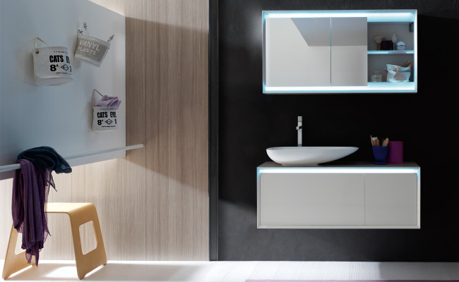 Il taglio a 45 gradi crea una sporgenza della scocca rispetto al frontale: un elemento di design caratteristico che definisce l'estetica contemporanea di E.45, insieme ai led e alle specchiere contenitore.