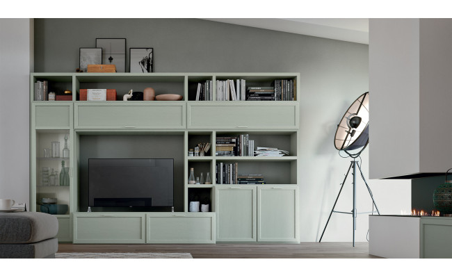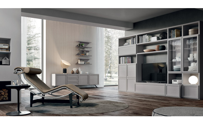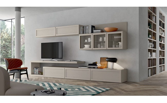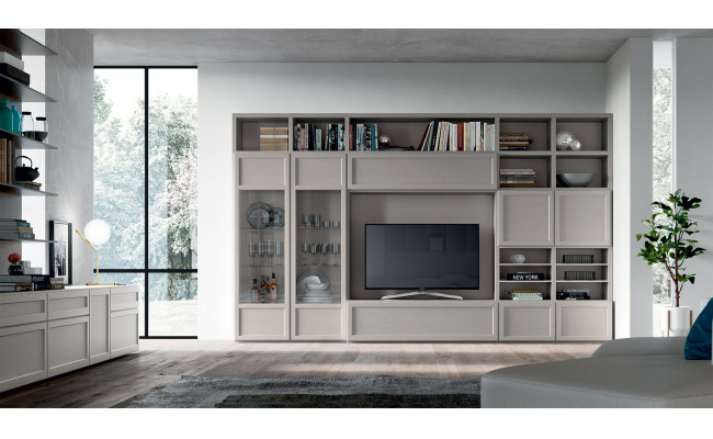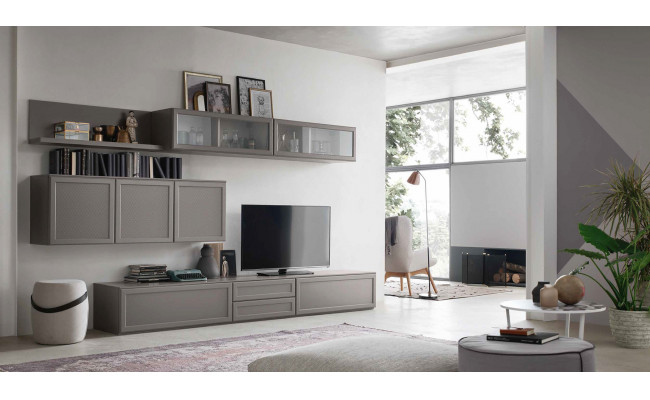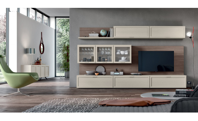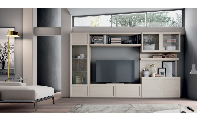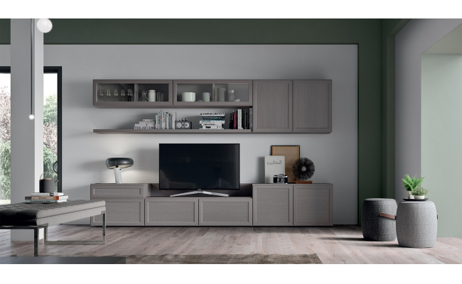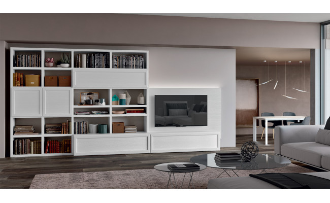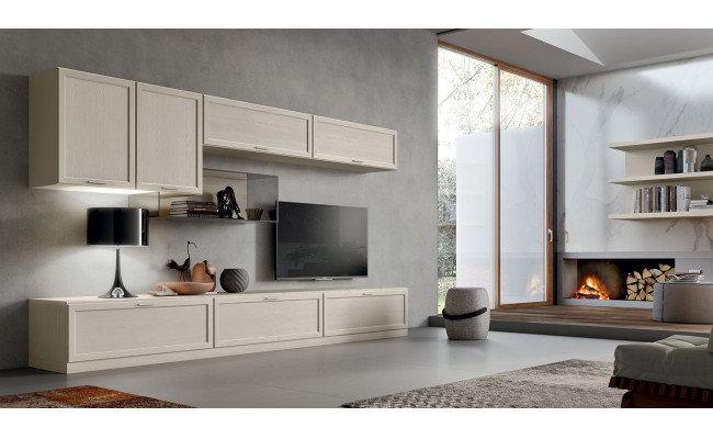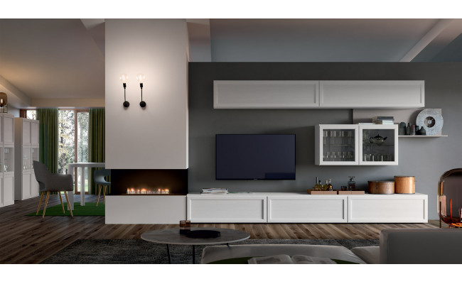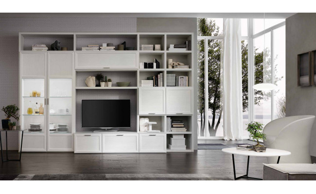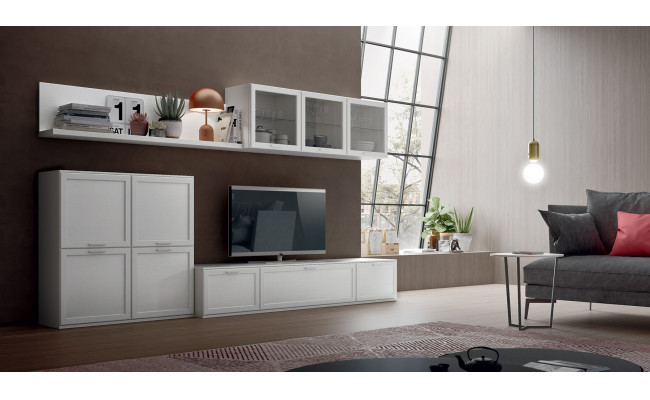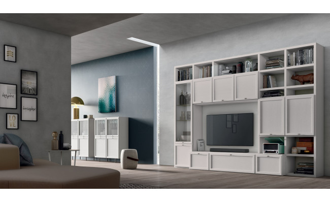 Composizione della collezione soggiorni Gardenia, con struttura in pannelli di particelle di legno con rivestimento sintetico esterno con poro segnato frassino. Ante e cassetti con rivestimento esterno bianco con cornici sagomate in finitura frassino. Colori disponibili: prugna, bianco, nero. Prevista inoltre la versione nella finitura tabacco con pannelli in legno impiallacciato frassino e cornici in frassino massiccio.