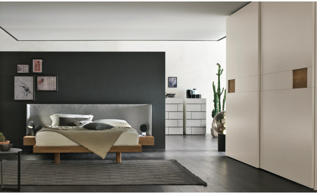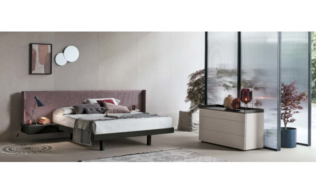 Il letto Fusion di Tomasella è, di nome e di fatto, una totale fusione di elementi: testiera, giroletto e comodino formano un tutt'uno di grande presenza scenica.