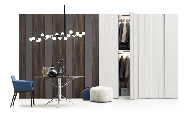 Il pannello è disponibile in tutte le tonalità laccate opache, nelle finiture materiche, eco-legno e super-matt. Fascia centrale in tutte le tonalità laccate opache e lucide, nelle finiture eco-legno e materiche rovere bianco e rovere tortora. L'armadio Plissè può essere a incasso, a muro o angolare.
