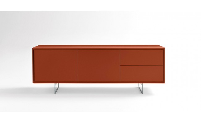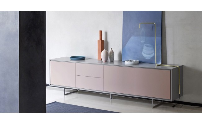 La madia Shadows, sostenuta da sottili gambe metalliche cromate o laccate, è caratterizzata da una gola che corre intorno a tutto il perimetro di ante e cassetti.