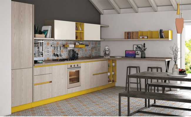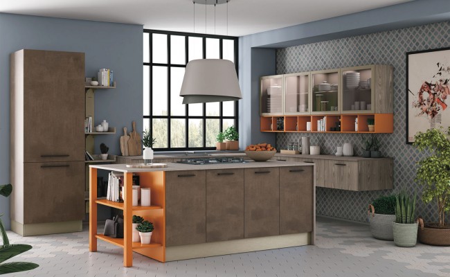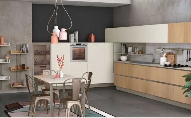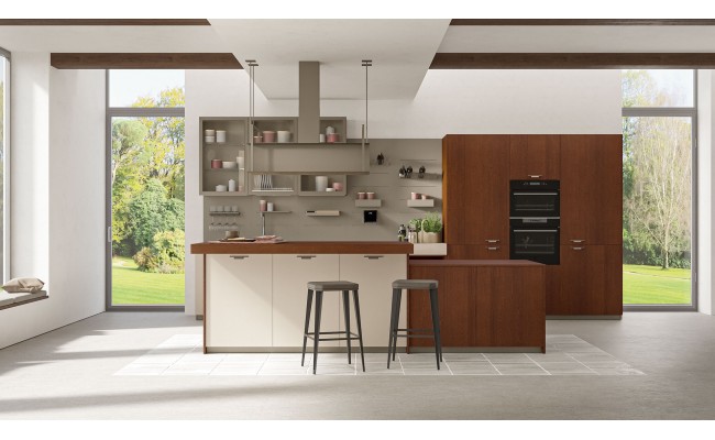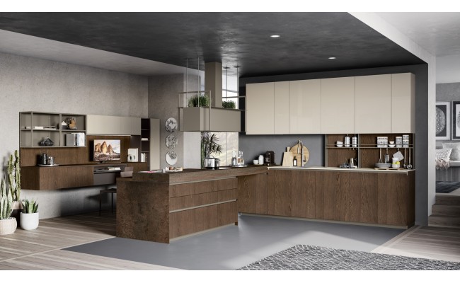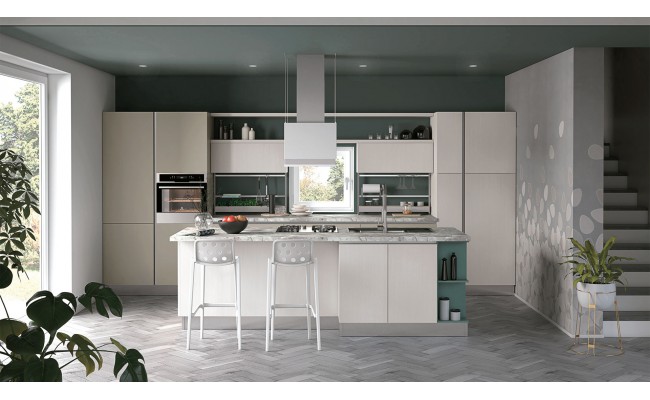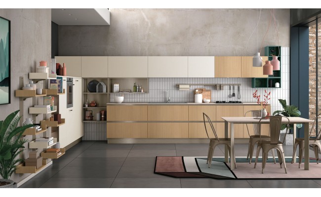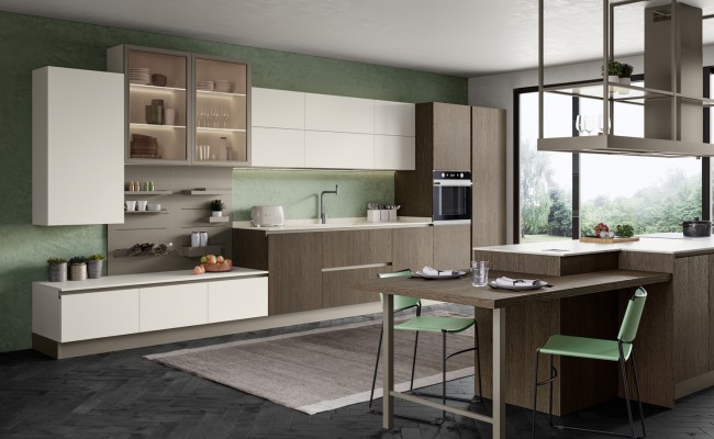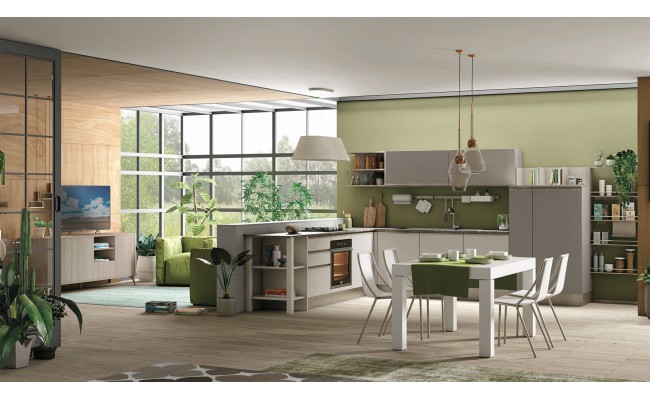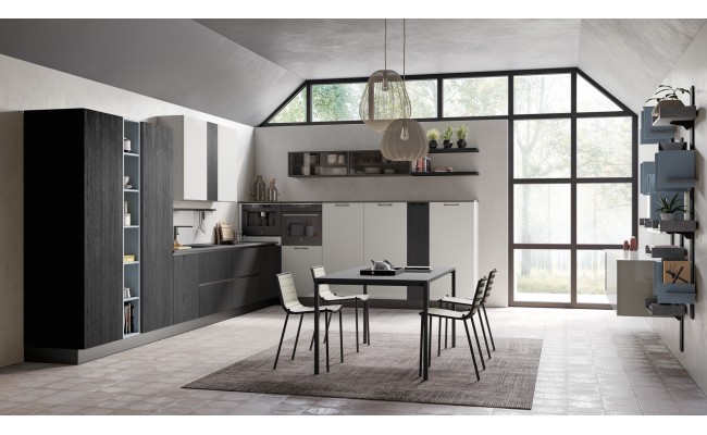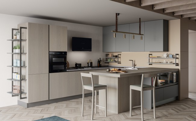 Un plus distintivo è la libreria Totem, sistema a parete che alterna mensole e contenitori sinuosi, creando connessioni visive tra cucina e living ; Le composizioni giocano sull’accostamento tra finiture materiche (es. Rovere Ortisei) e colori soft, con soluzioni in marmorizzato, melaminico o laccato, per ambienti giovani, accoglienti e raffinati.