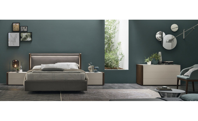 La testiera è ulteriormente valorizzata da due tagli di luce che danno risalto al design. Un dettaglio utile per la lettura e decorativo per la camera da letto. L'atmosfera si fa più soft e a notte entra in scena.