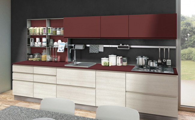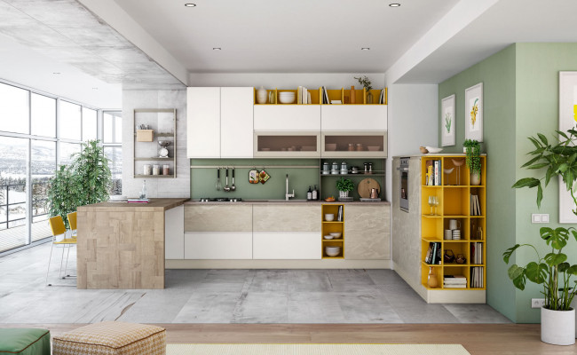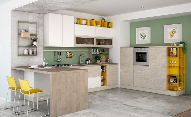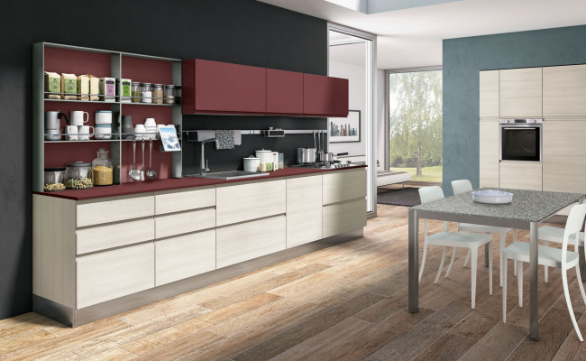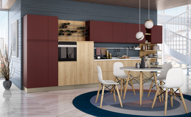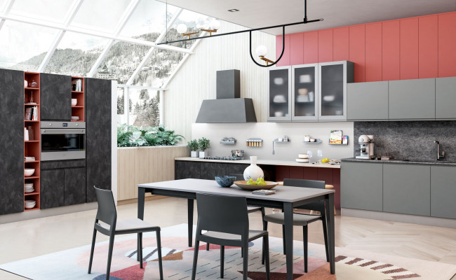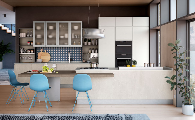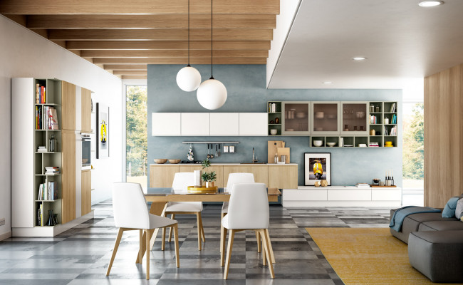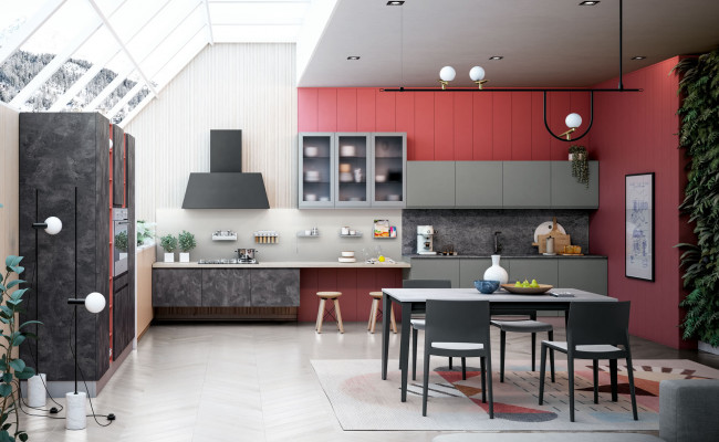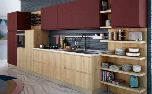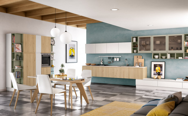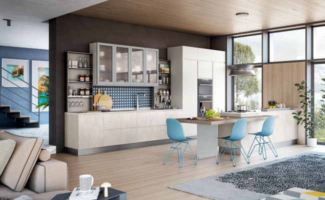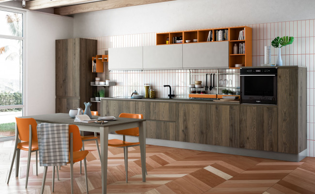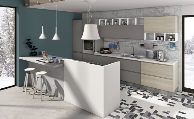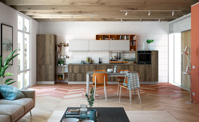 Jey feel è una cucina moderna che si apre con naturalezza al living definendo la sua anima urban chic. Valorizza e personalizza ogni spazio grazie alle combinazioni di legni effetto materico, legni effetto stone e marmo opaco per basi, colonne e piani di lavoro.