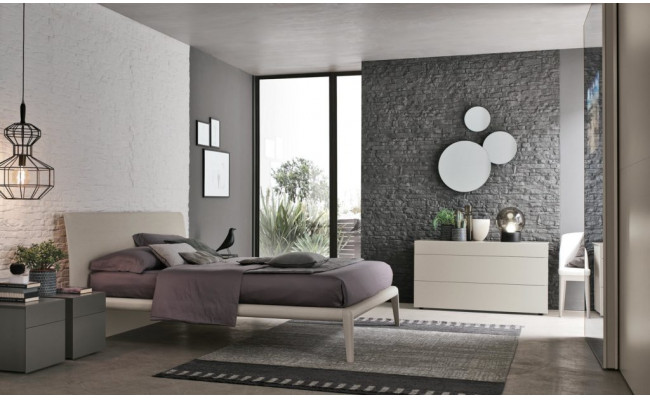 La testiera leggermente curvata e appoggiata a terra è l'elemento distintivo del letto Prado imbottito di Tomasella.