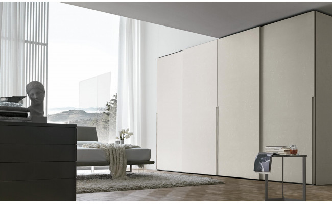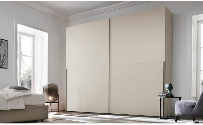 La maniglia in metallo integrata all'anta divide in due l'altezza dell'armadio.