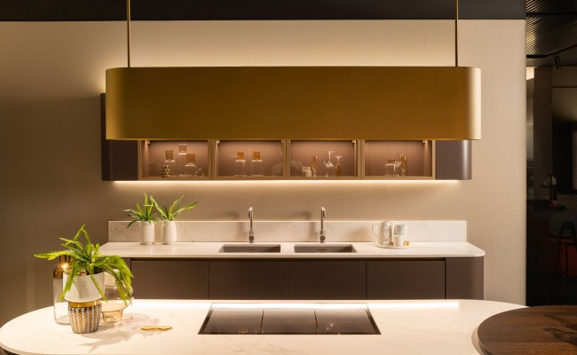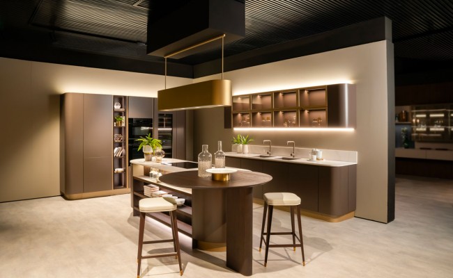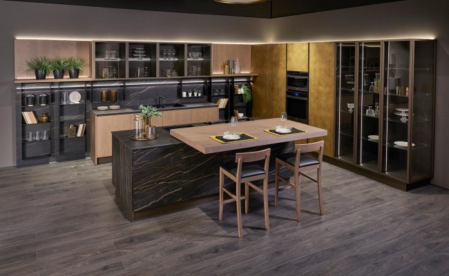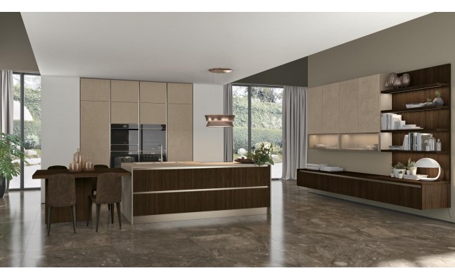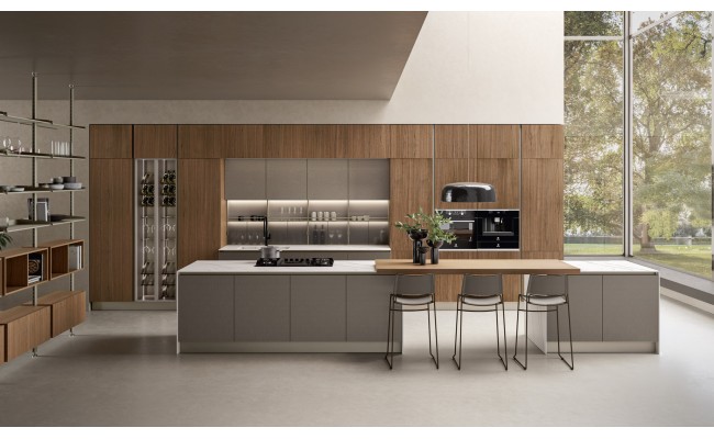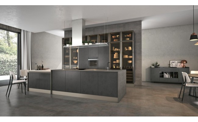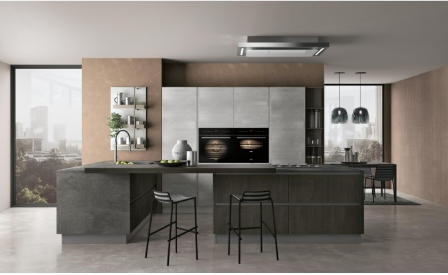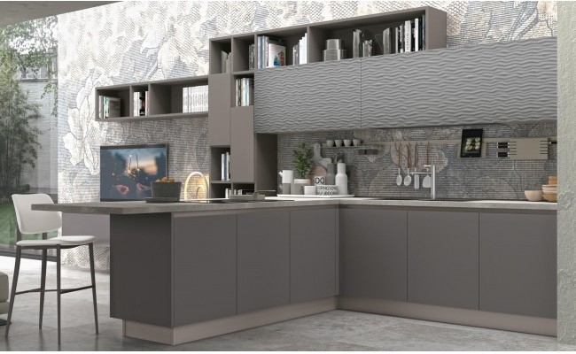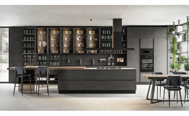Particolarmente scenografica è la versione Design Collection, dove il gres Mutina con bassorilievo crea contrasti eleganti tra luci e ombre. Le combinazioni cromatiche sono numerose: grafite, gesso, avana, termocotto, con accenti in noce canaletto, metallo liquido ossidato (ottone, rame), laccati urbani e industriali