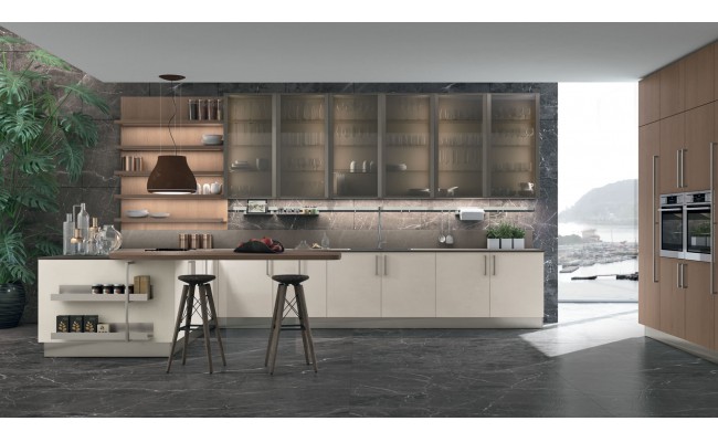 La composizione alterna pensili chiusi e vani a giorno, generando continuità visiva e giochi di luce e ombre che valorizzano lo spazio domestico
