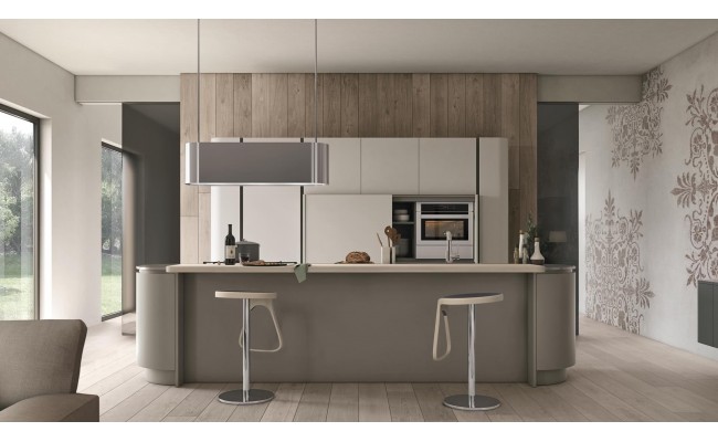 Clover si adatta con naturalezza a spazi open‑space grazie a basi sinuose e composizioni fluide che integrano living e zona pranzo. Le soluzioni con isola o penisola offrono un’esperienza accogliente e dinamica, orientata all’ergonomia