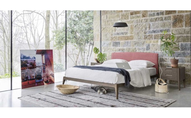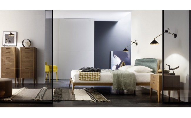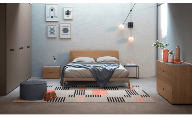 Dalle linee arrotondate, il letto Siri di Novamobili ha un disegno semplice e senza tempo. Disponibile in legno impiallacciato in due versioni, rovere terra e rovere miele.